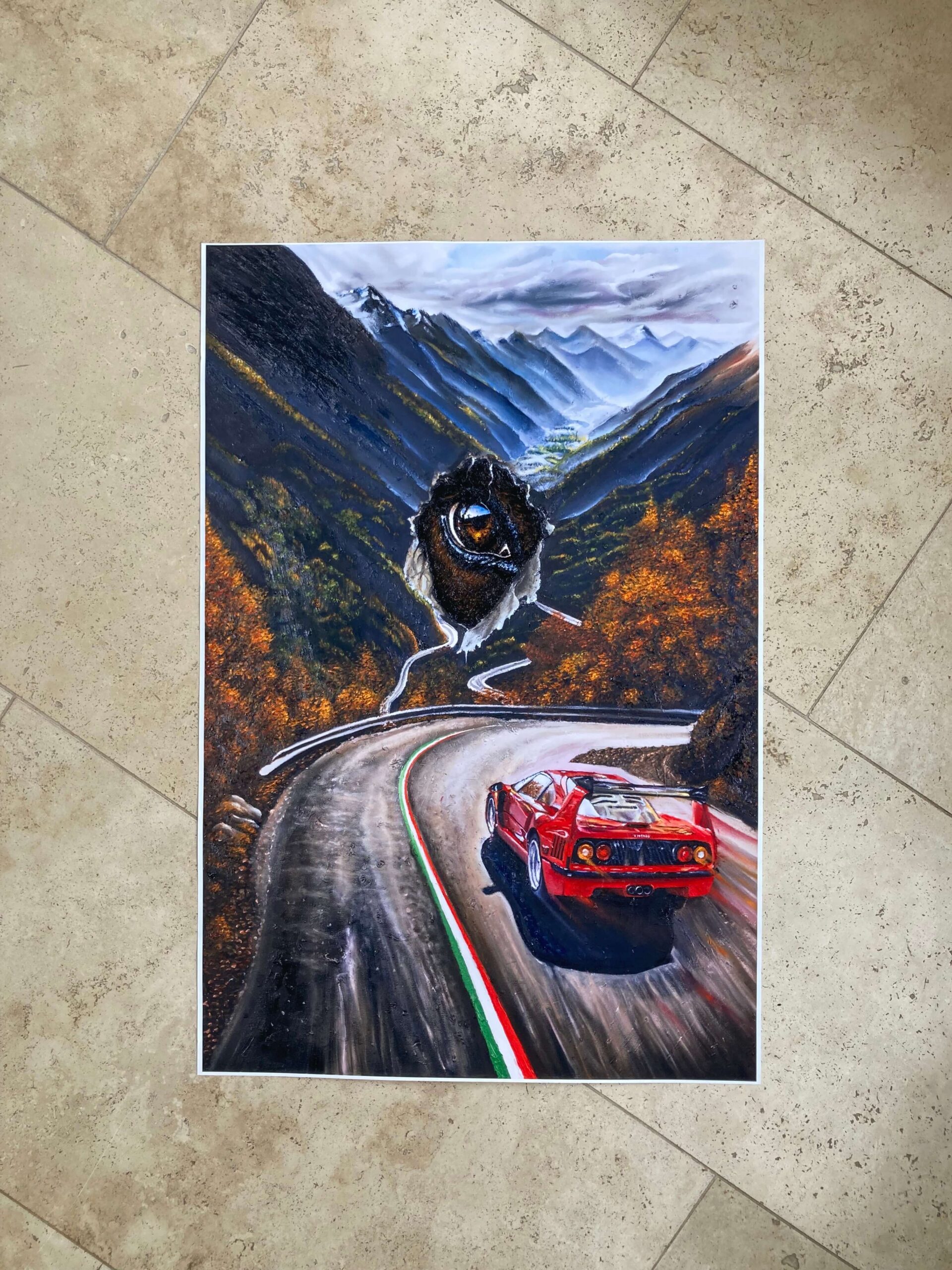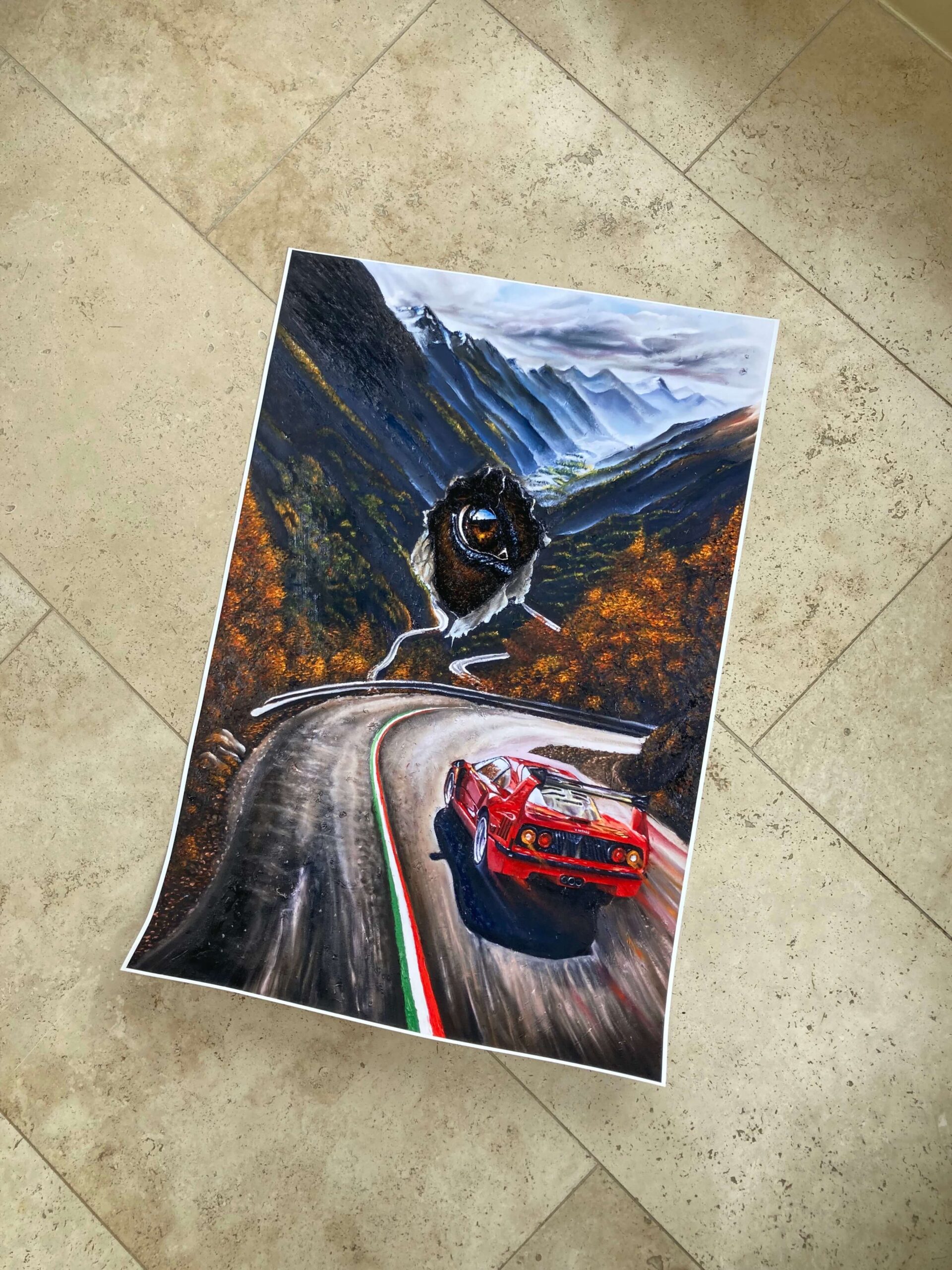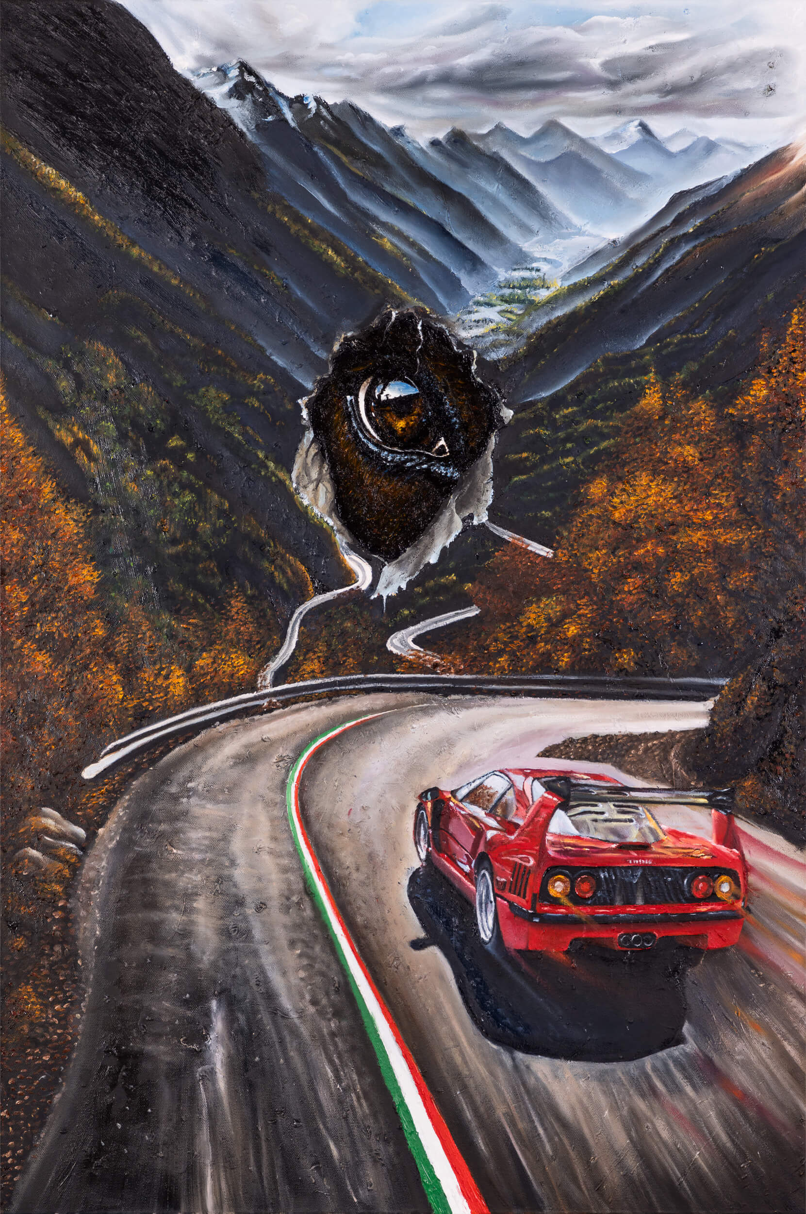 Set against the backdrop of a dramatic Alpine pass, the F40 carves through the winding road, its scarlet bodywork framed by the green, white, and red of Italy’s national colors. Autumn leaves blaze in the valleys below, while snow-dusted peaks rise into the distance. From within the mountain itself, a surreal, unblinking eye peers through—a symbolic guardian of the road, watching the fusion of human ambition and natural majesty.